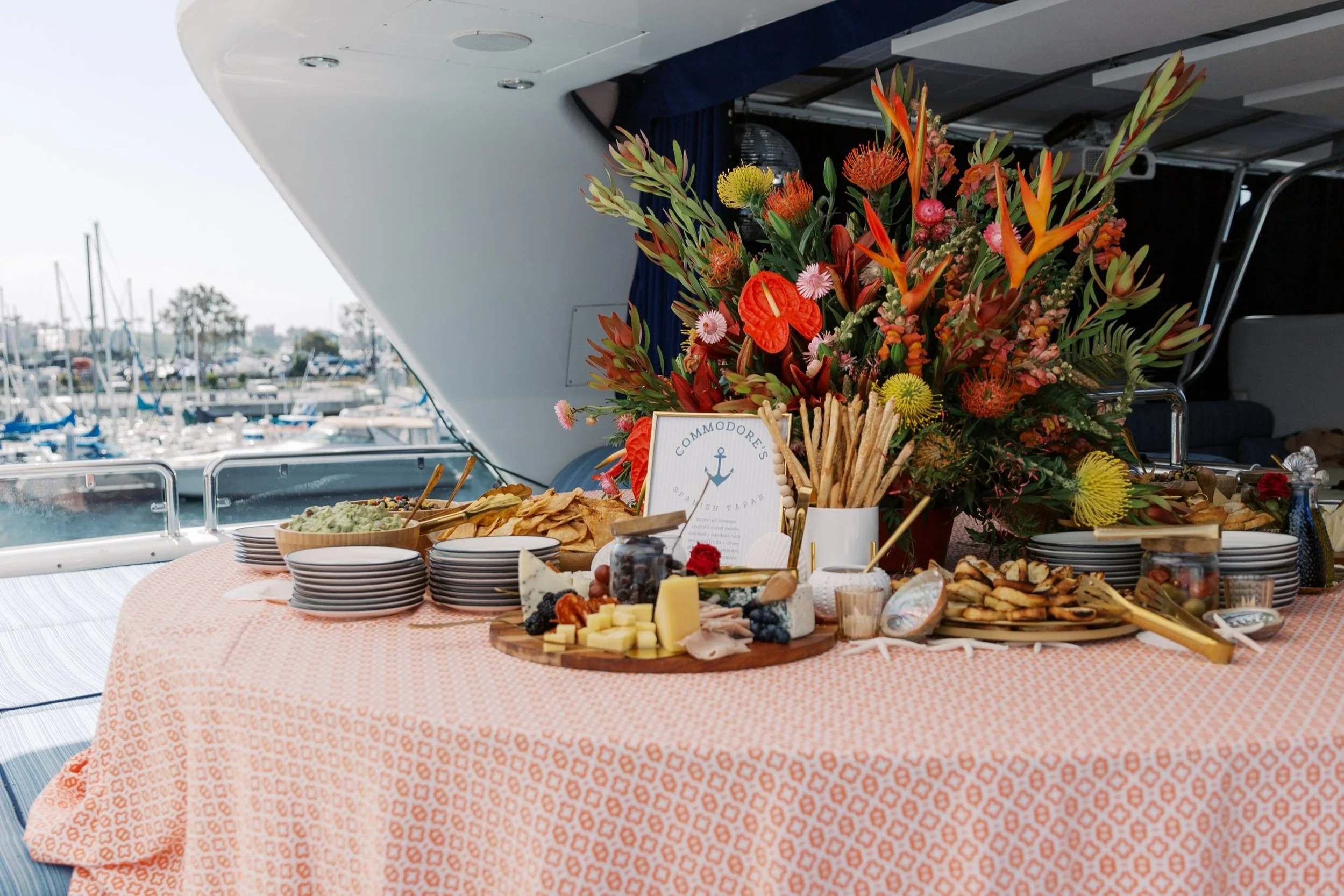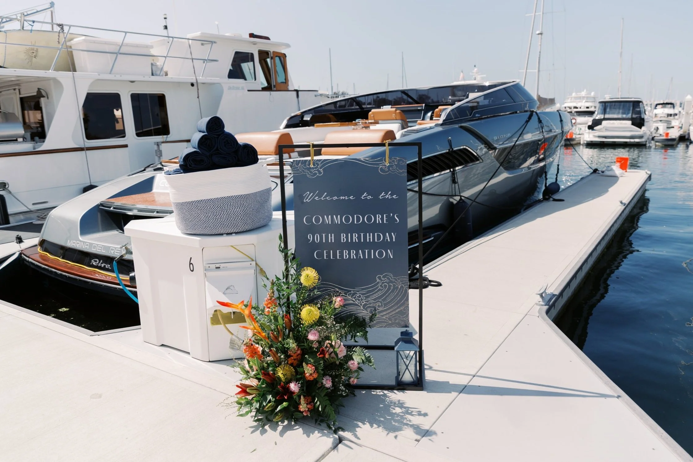 Guests were welcomed in true Commodore fashion with a classic red carpet rolled out along the dock, creating an elegant and nautical-inspired entrance. A warm breeze, gentle harbor views, and a personalized welcome sign greeted everyone as they arrived—setting the perfect tone for an evening of celebration by the sea.