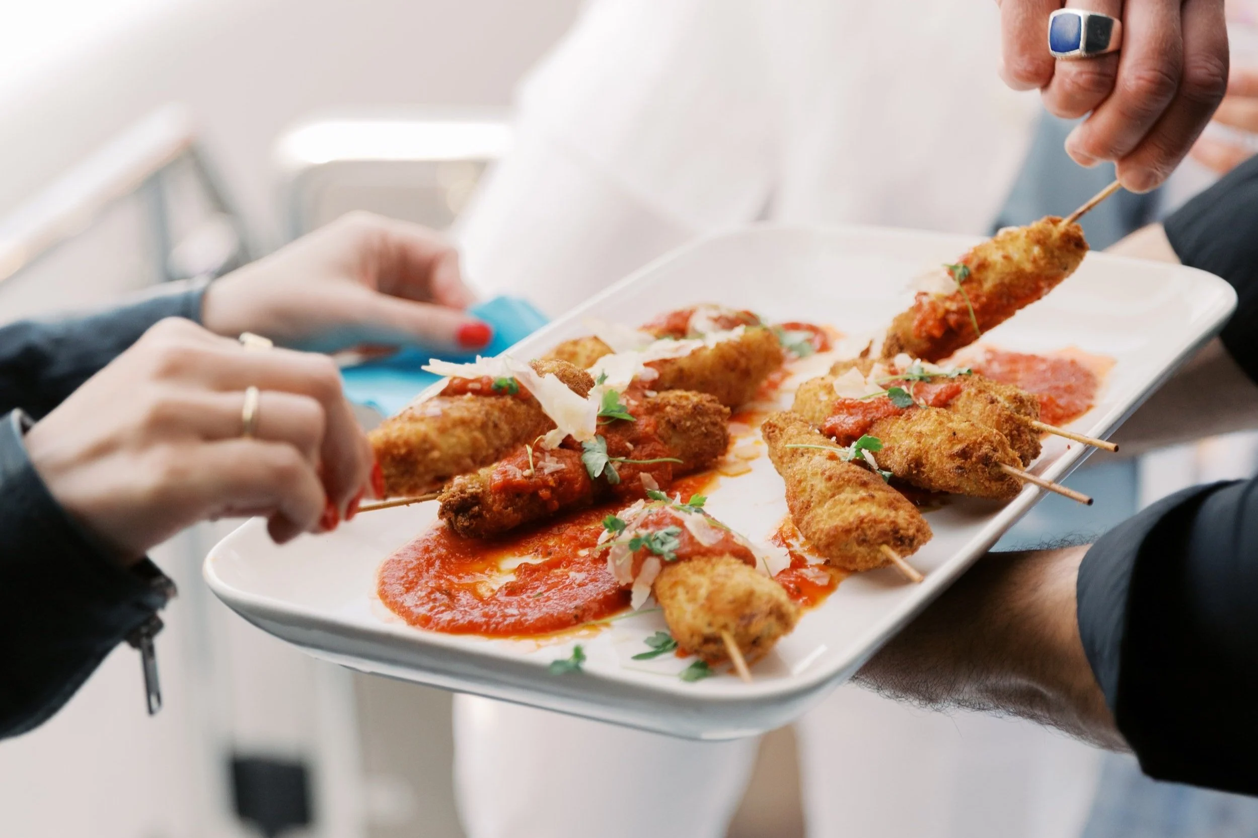 In addition to tray-passed bites and a well-rounded menu, we featured a variety of thoughtfully curated food stations that made the dining experience feel fun, interactive, and elevated. From grilled skewer displays and vibrant seasonal salad bars to chef-hosted carving boards and gourmet small plates, each station was designed to delight the senses and keep the crowd engaged. Our team of professional caterers kept everything running smoothly and beautifully plated, ensuring that every guest felt well-fed and well taken care of.
