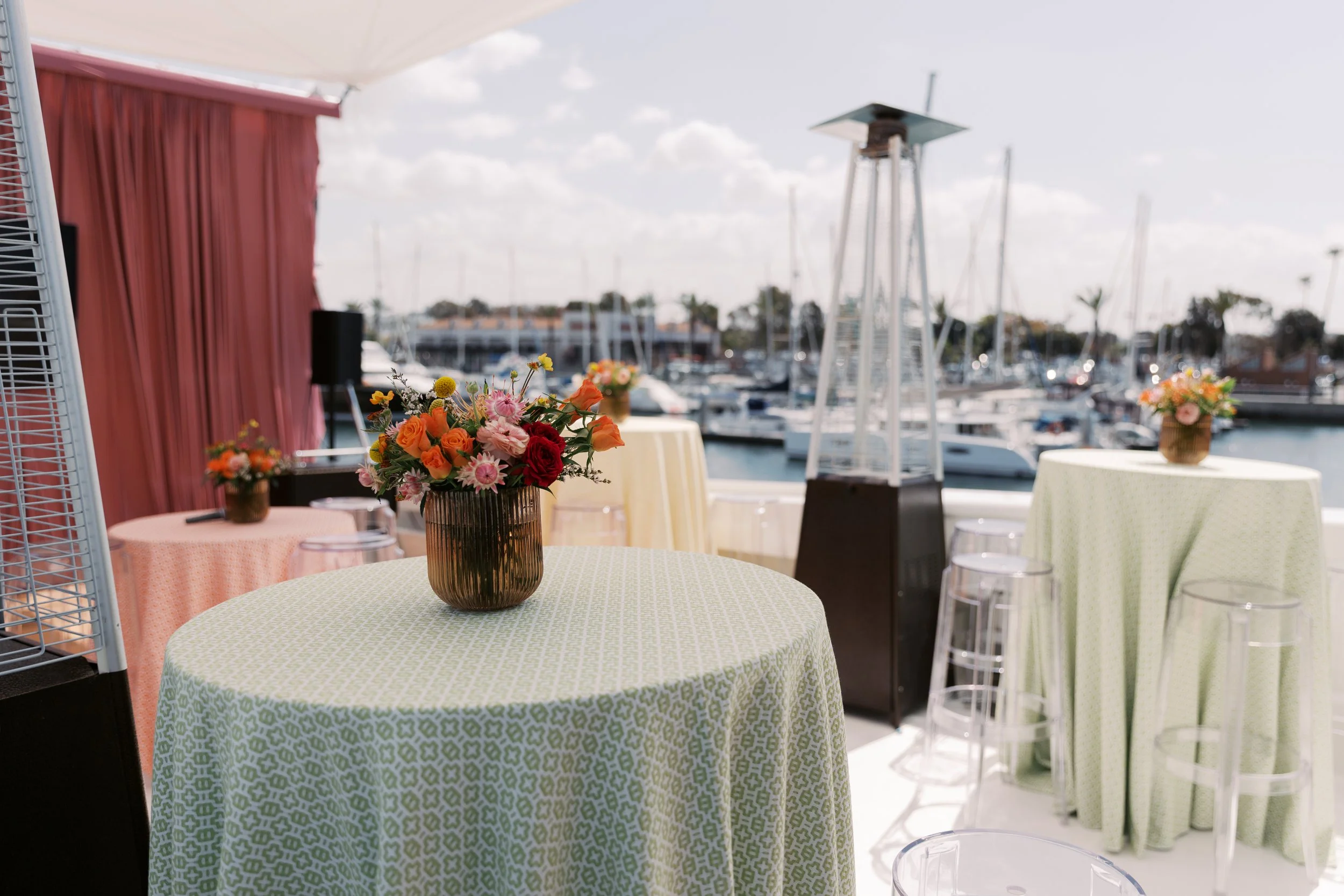 From sunrise to sunset, the tablescapes were nothing short of stunning. Each high-top table was draped in richly textured linens—one in a bold blue and gold lattice, the other in a fresh, springy green—and surrounded by modern clear acrylic stools that added a sleek, contemporary edge. Topped with simple yet striking floral arrangements in charming vessels, these setups were a perfect blend of sophistication and seaside charm. Whether guests were sipping cocktails, enjoying a skewer, or pausing between musical acts, these beautifully styled tables gave them the perfect perch to take it all in.